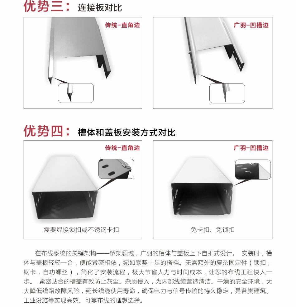 廣羽橋架成功開發(fā)了阻燃塑料、鋁合金、鋼制光纖槽道三種材質(zhì)的光纖槽道,為客戶提供更實(shí)用的產(chǎn)品,更少的施工時(shí)間,更靈活的槽道。